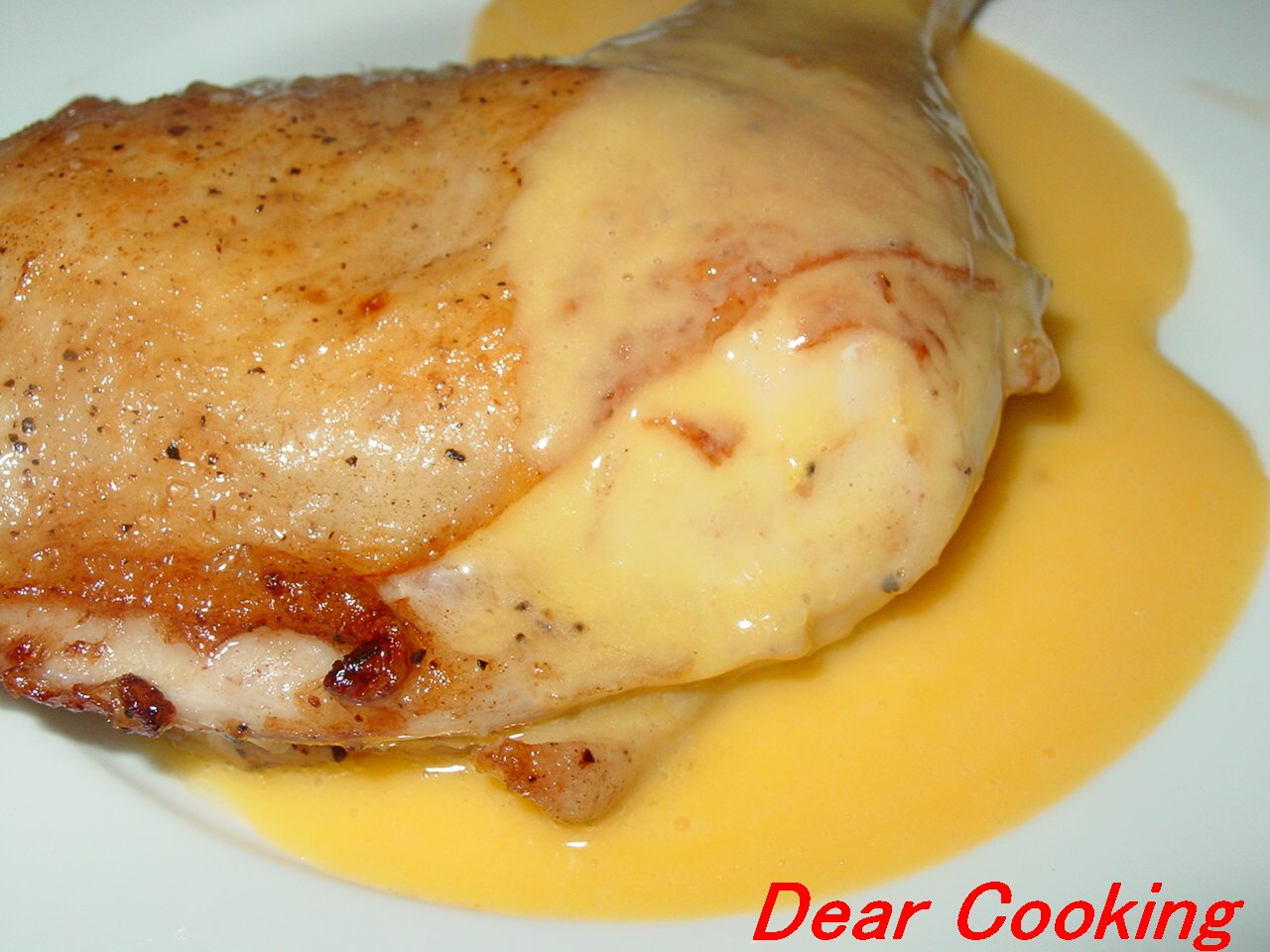 9.地鶏もも肉に火が通ったらお皿に盛り付け、温かいオランデーズソースをたっぷりとかけ美味しく頂きます。